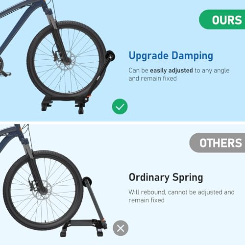 Diseño Mejorado – Introduce un robusto mecanismo de amortiguación que permite ajustar fácilmente el ángulo del soporte según sus necesidades. Evita cualquier salto o volcamiento, asegurando una posición de estacionamiento segura. Con solo dos simples pasos, puede estacionar su bicicleta fácilmente sin necesidad de usar el pie para evitar que el soporte se deslice y sin esfuerzo adicional para fijarlo.