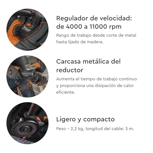 Rendimiento potente: Motor de 850W con potencia máxima de 1100W y 11,000 RPM, ideal para tareas de corte y desbaste eficientes en una variedad de materiales.