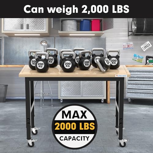 120CM Banco de Trabajo,Banco de Trabajo de Madera de Caucho Tiene Ajustable 5 Alturas Diferentes,Mesa de Trabajo de Madera Dura Capacidad de Peso de 900KG,con Ruedas de Freno